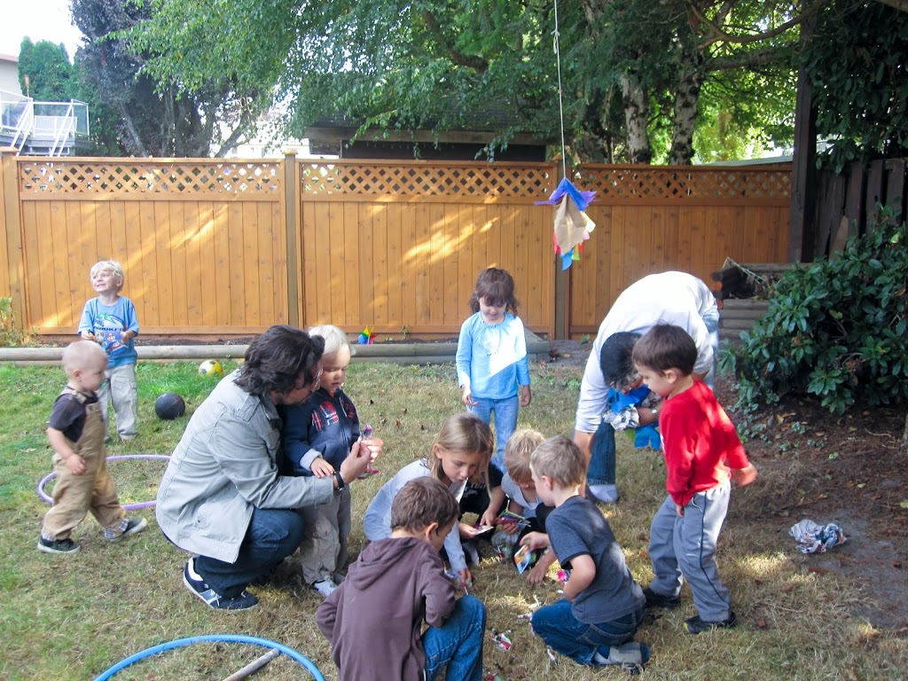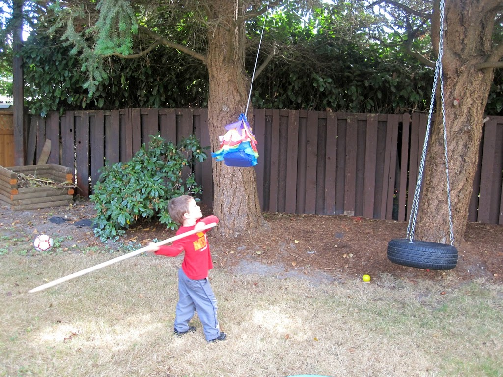 I wasn’t sure how well it would work, but it turned out pretty well. It held up better than I thought it would to repeated beatings from the children. Everyone got several chances at the pinata before it was finally broken open.