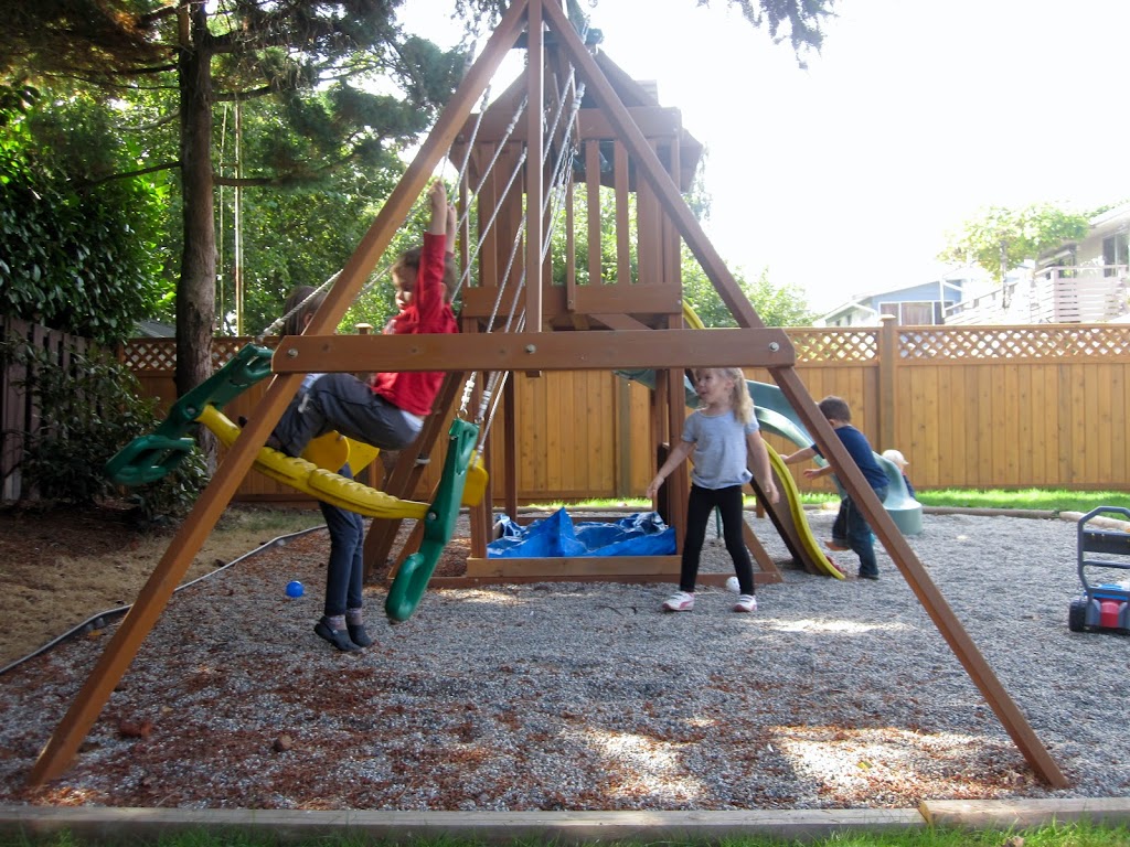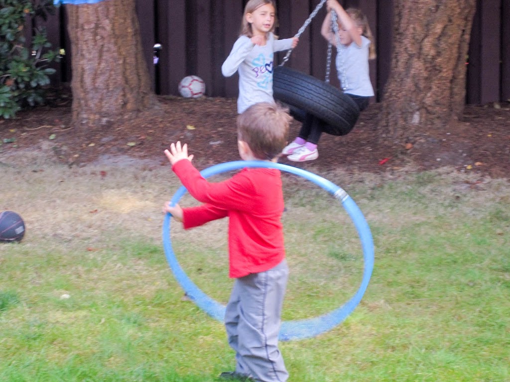 It was such a beautiful sunny day and it actually felt hot out, much to our surprise, so we took advantage of the nice weather and let the kids play in the backyard. Between our play set, tire swing, bouncy castle, hula hoops, and ball pit, there was lots to keep them busy while the grown-ups watched and chatted on the balcony.