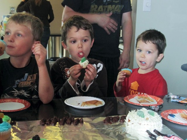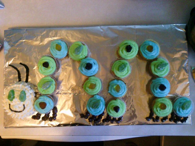 Next, we opened presents and then had cake. Bennett had originally wanted a Spiderman cake and I was fully intending to make one, but he changed his mind and started asking me for a caterpillar cake. I don’t know where he got that idea, but it was actually a really good one. I just decorated cupcakes with blue and green icing and formed them in the shape of a caterpillar.