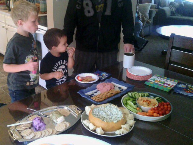 We had spinach dip in a hollowed sour dough loaf, hummus, veggies, goat cheese, sausage, crackers, and a fruit platter.