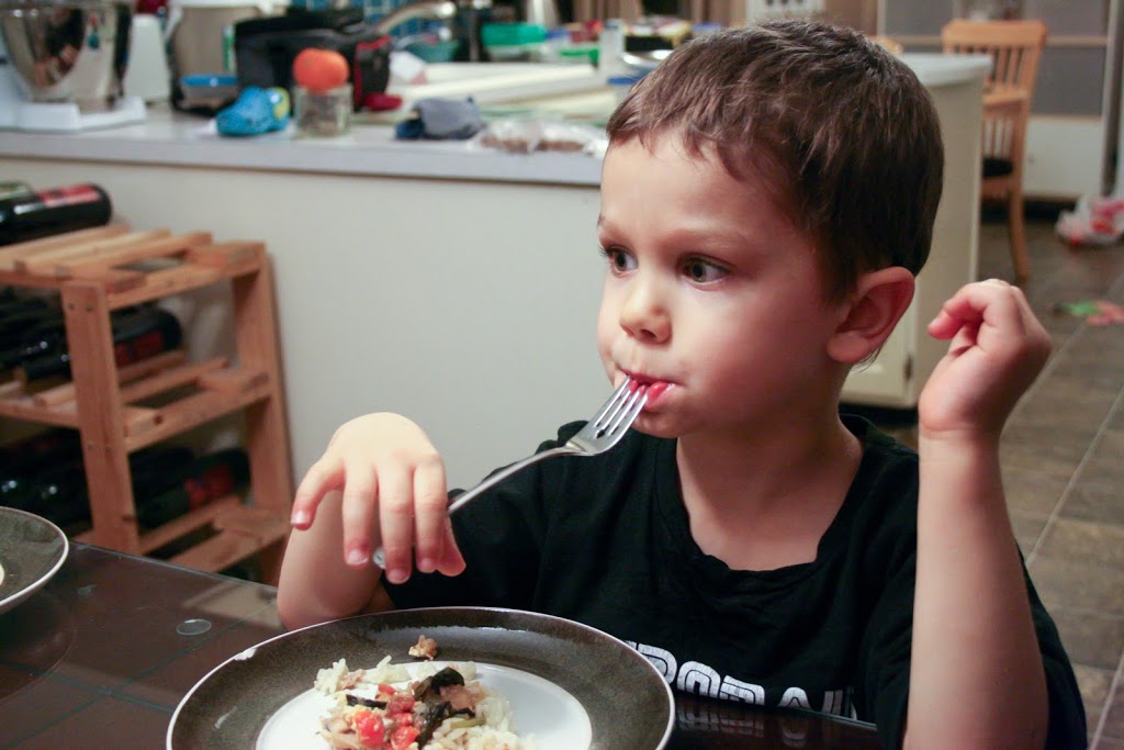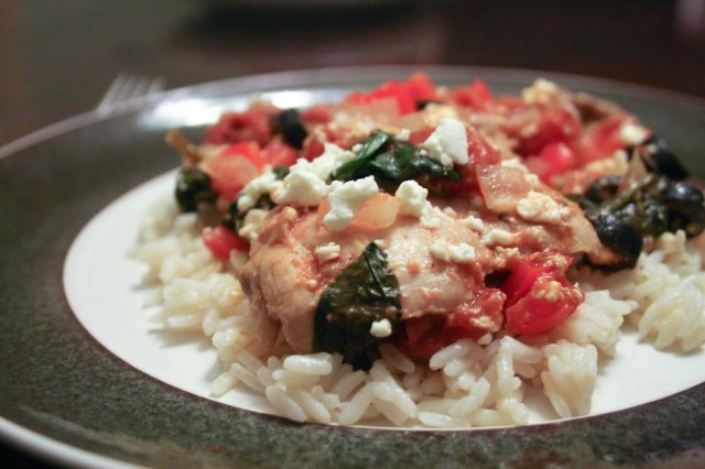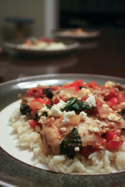 This recipe came about because I happened to have olives in the fridge left over from a somewhat unsuccessful attempt at Baked Eyeball Casserole for Halloween (the “eyeballs” melted because I put it back in the oven to keep it warm!). Anyway, I had these olives to use up. I also had baby spinach that was starting to wilt, and a container of feta with a looming expiry date. I decided these were great ingredients for something Greek. I pulled out some chicken thighs from the freezer and got to work. I worked solely on the stove top for this meal, which made things a little simpler. When I dished out this meal, Bennett came running right away and finished his dinner before Cole had even started! Cole wasn’t that interested but after some coaxing from Tony, who said this was a really nice dinner, he finally tried it and liked it. So I’d say this was a successful meal- yay! I always like those..