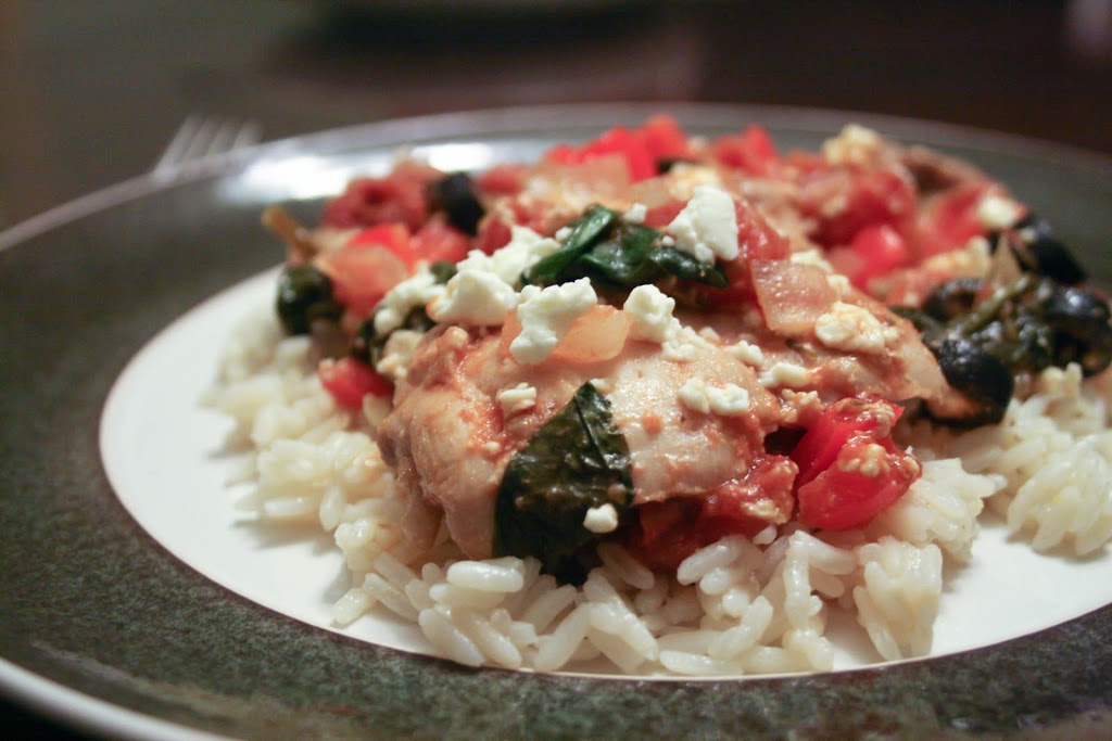 In a large non-stick skillet, heat oil over medium heat. Add garlic, onion and red pepper. Saute for 2-3 minutes until softened. Add chicken and cook for a few minutes on each side. Add lemon zest, oregano, stewed tomatoes, white wine and olives. Cover loosely and simmer for about 15-20 minutes, until chicken is fully cooked. Add spinach, feta, salt and pepper. Cover again and simmer until spinach has wilted. Serve over Lemon Garlic Rice.