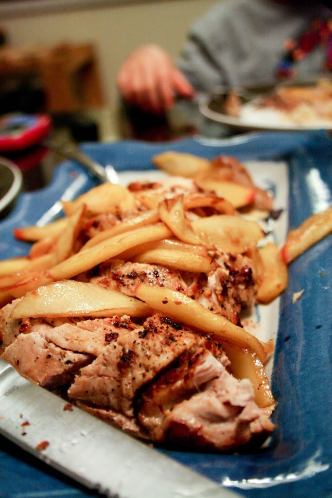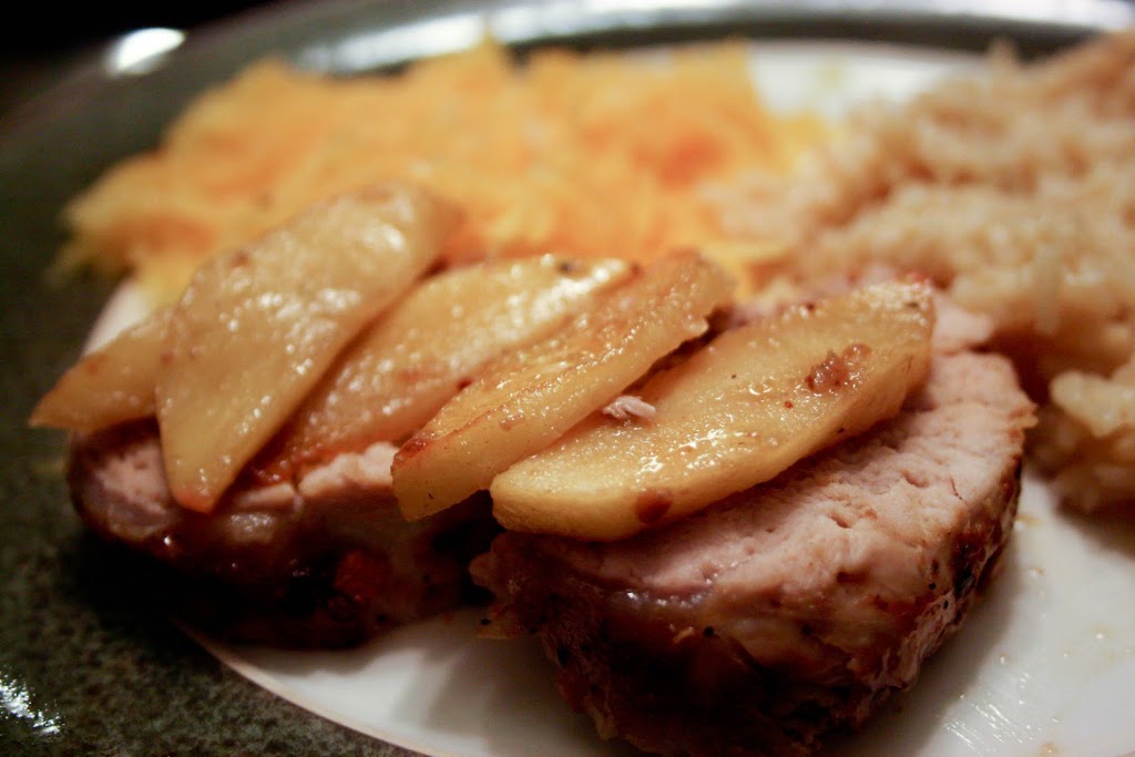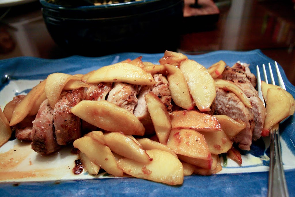 Once the tenderloin is done, slice it and top it with the cooked apples before serving.