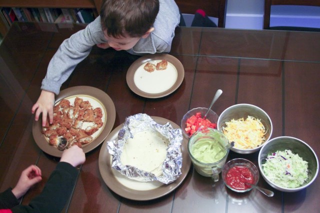 I put the meal plan on the fridge so everyone can see what’s on the menu for that day and I don’t have to cringe at that perpetual question: “what’s for dinner?” It also makes it easier for Tony to help get dinner started if I’m preoccupied with the baby. He does alright with cooking as long as he knows what he has to make and has a recipe for it. I’ve been trying to keep meals as simple as possible so that he can help out more. These fish tacos are definitely simple enough for him. We used frozen fish sticks as a shortcut and they worked great. Dinner was ready in 20 minutes and it was a big hit with everyone, even the boys. They loved being able to assemble their own tacos with their favourite fixings. There was no whining…except when the tacos were all gone!