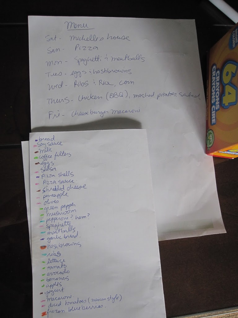 With a new baby keeping me busy, I’ve had to find ways to save time in the kitchen. The first step was to be as organized as possible with the initial meal planning and grocery shopping. On Friday nights at dinner, we decide as a family what meals we’re going to have for the following week. Everyone gets to pick at least one meal. I was hoping this would result in less whining at mealtimes, but unfortunately the boys often change their minds and decide they don’t like what they originally picked. Seriously? I don’t have the energy right now to worry about it too much though. If they don’t like it, too bad, I tried. Anyway, on Saturday morning I take that meal plan and make a shopping list, then I take crayons and colour-code the list by sections in the grocery store so I can get my shopping done faster and more efficiently.