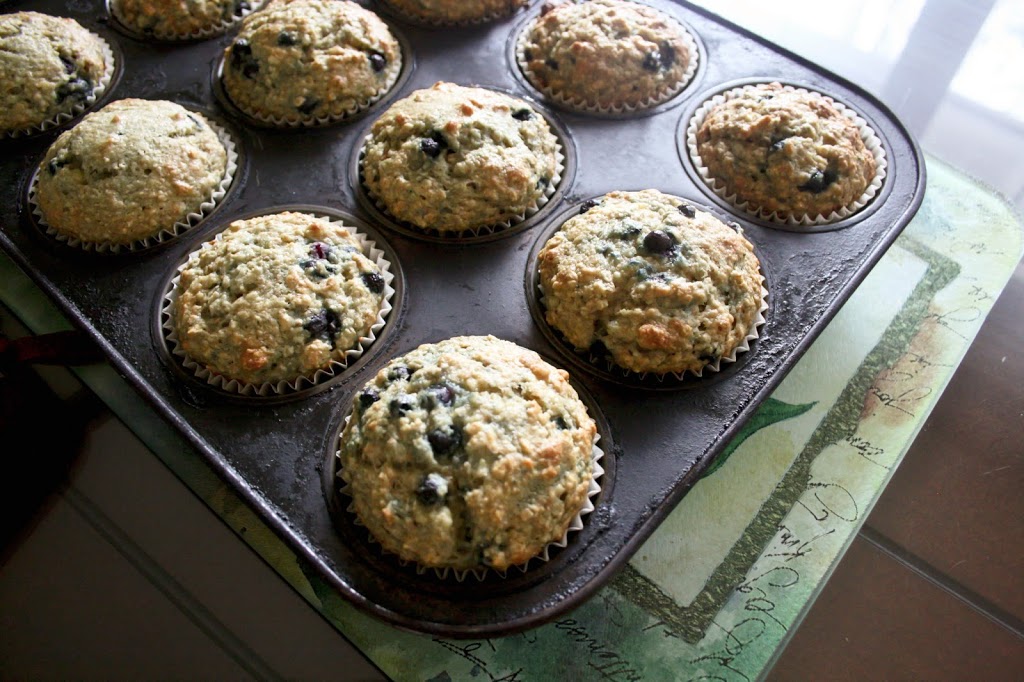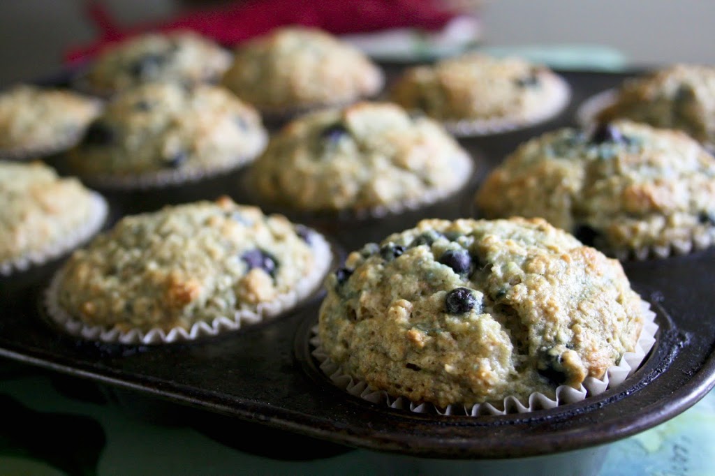 I can’t believe I haven’t posted this recipe before because it’s my all-time favourite muffin recipe. I make them more often than any other muffins. The whole family loves them warm out of the oven for a snack, lunch, or breakfast. I tend to have all the ingredients on hand, but if I don’t, it’s easy to substitute ingredients for something I do have. For example, if you don’t have oat bran you can use wheat germ. If you only have bananas but not applesauce, just use all bananas, or vice versa. If you don’t have blueberries, you could use another fruit. Play around with it and find what you like best.