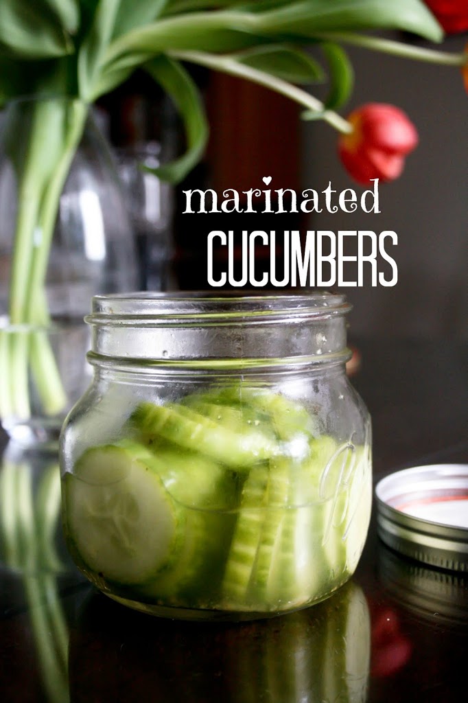 Place all the ingredients together in a jar, then cover it and shake it up to coat the cucumbers and dissolve the sugar. Refrigerate for at least 2 hours (but preferably overnight), and shake the jar every so often to blend flavours.