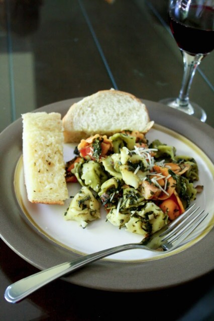I hesitate to even call this a recipe because it’s embarrassingly simple. The fact is that sometimes you need simple. There are nights when I just don’t have the energy to think about making dinner. This meal is perfect for those kind of nights. I usually buy tortellini when it goes on sale and keep it in my freezer for just such an occasion. All I need to do is add a few ingredients to it to make it a delicious dinner. If you want to keep it really simple, just add pesto or sauce and you’re done. This time I had a few items in my fridge that I needed to use up, so I tossed them in the skillet and dinner was ready in no time.