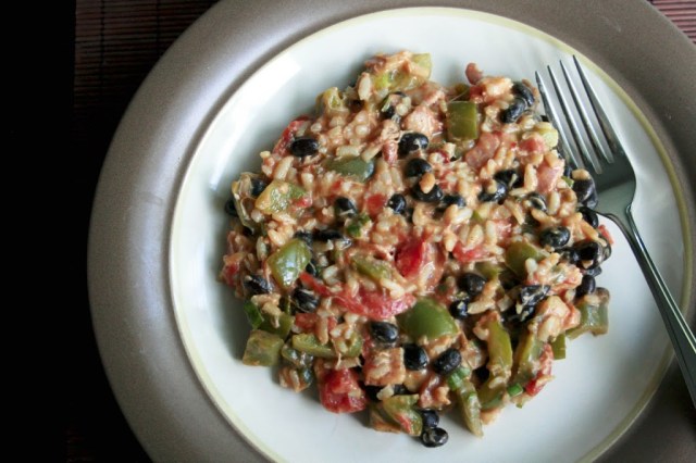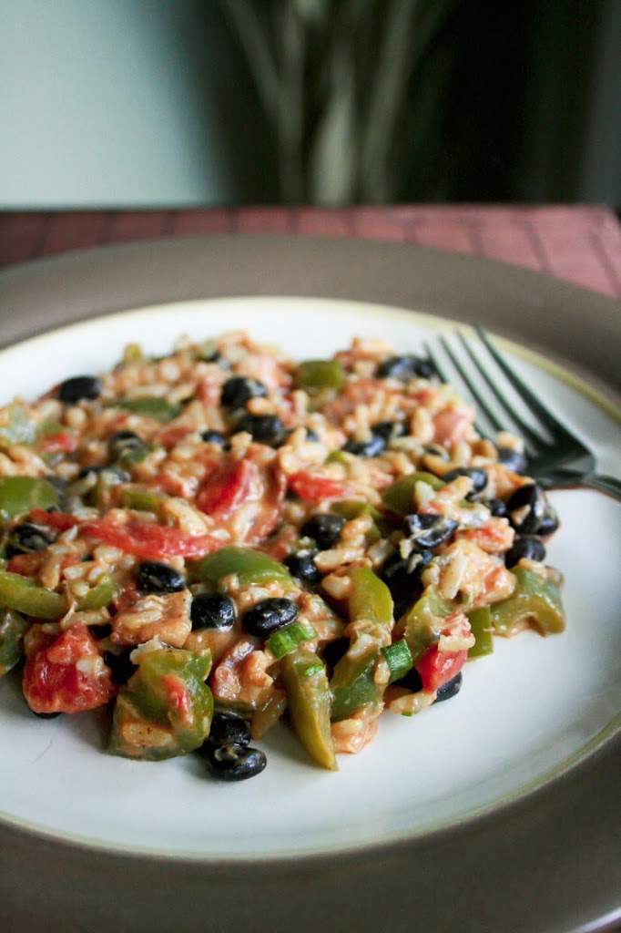 This recipe is inspired by Kevin & Amanda’s Cheesy Chicken Bacon Broccoli and Rice. I love the idea of adding cheese sauce into the rice for an incredibly creamy, extra cheesy dish. Instead of chicken and broccoli, I’ve used green peppers and black beans. It’s similar to a family favourite of ours, Mexican Rice and Bean Casserole, except this one is made completely on the stove-top so it’s really quick. If you have leftover rice, this meal is a perfect way to use it up. When I make rice for a meal, I’ll often make extra just so I have it on hand for recipes like this one. I think this would make a great meatless dinner too if you just leave out the bacon.