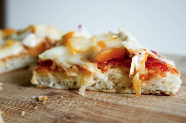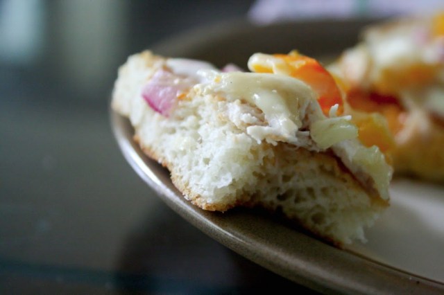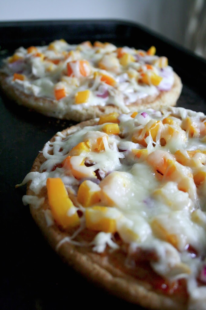 I bought a rotisserie chicken from the deli so we could have chicken pizza. I also used some regular pizza shells as well in order compare them. We had ranch chicken pizza, using ranch dressing as the sauce, and barbecue chicken pizza, using barbecue sauce. I topped them with pieces of rotisserie chicken, orange and yellow bell peppers, red onion, and mozzarella cheese. There were no baking instructions on the package for the pizza shells, so I just baked them at 425F for about 8 minutes, until the edges began to brown. I like my pizza a bit crispy, but if you want them softer you could use a lower heat.