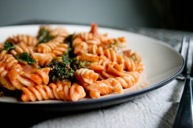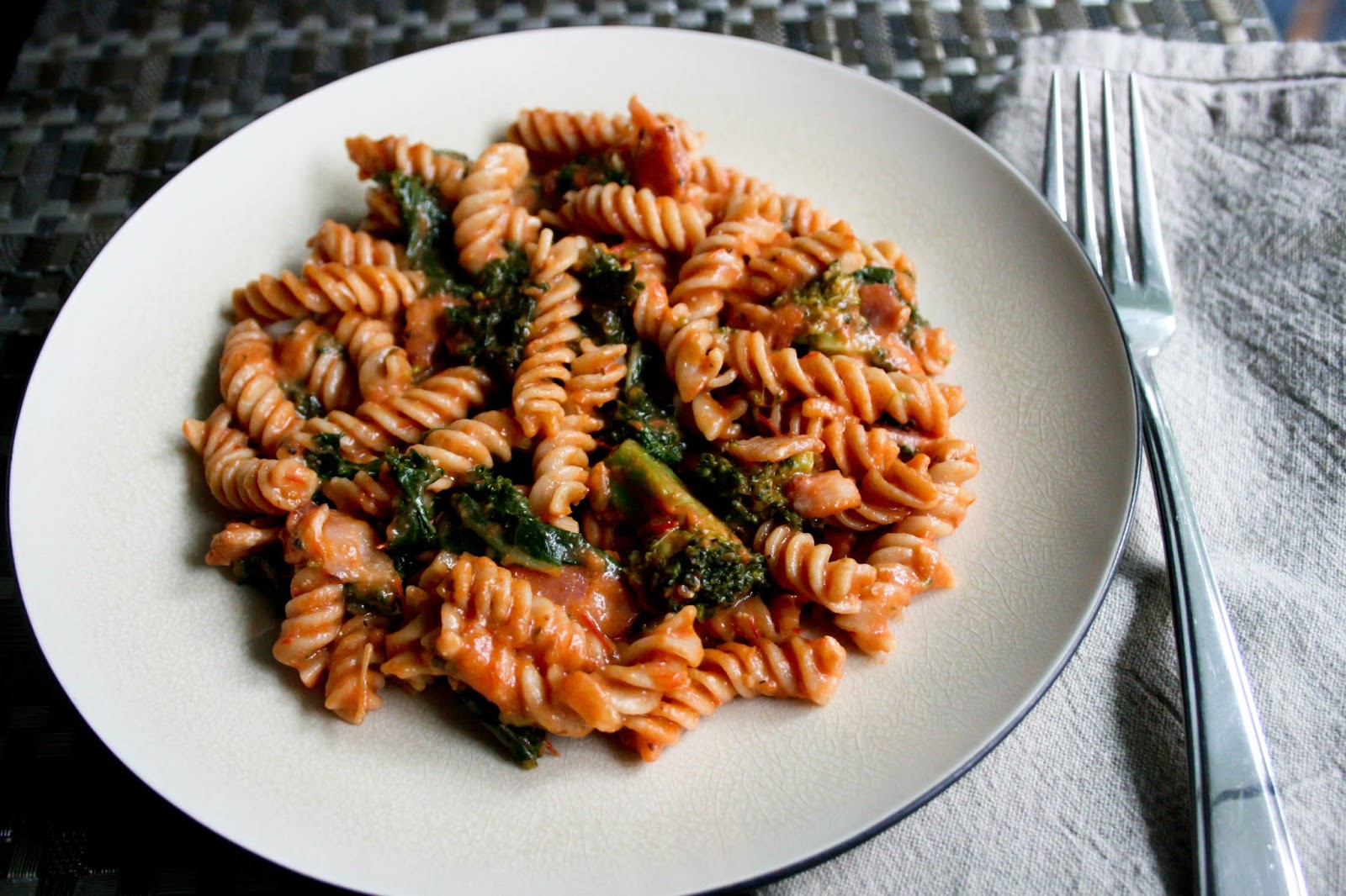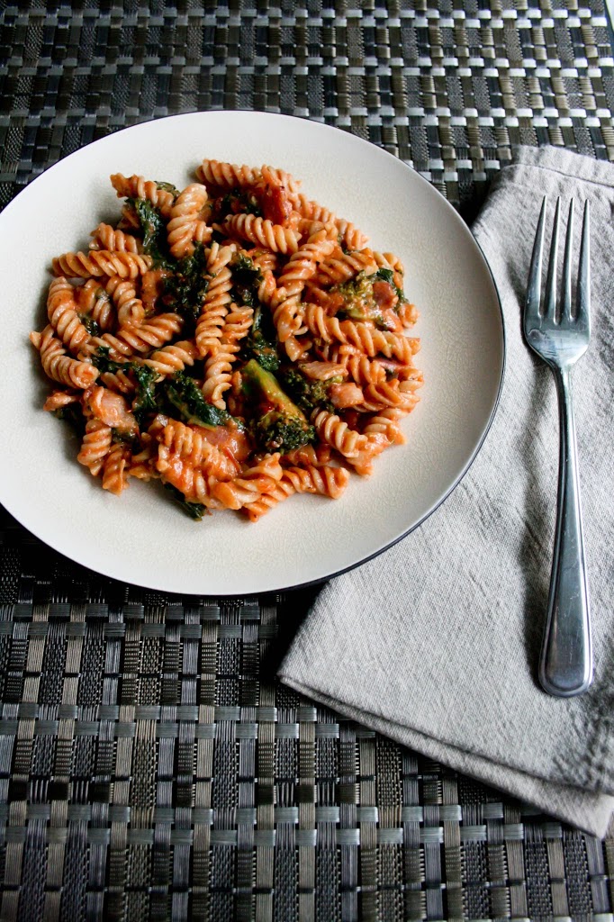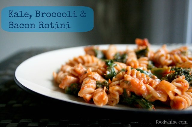 When I started making this dinner, I wasn’t even intending to blog about it. We had come home late from running errands and I had to whip up something quickly so we could get the kids to bed on time. I took a peek in the fridge and pulled out a few items that needed to be used up. I found kale, broccoli, half a jar of pasta sauce, and 5 strips of bacon. It was like my own version of Top Chef. I was short on time, and I had to work with what I had on hand. The result happened to be a very tasty meal that I hope to make on purpose next time.