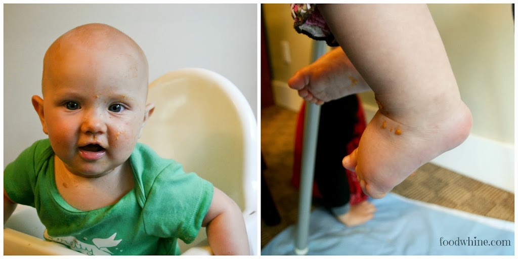 Since Ayla insists on feeding herself but isn’t so great at using a spoon yet, I cut up a dumpling and poured some of the soup on top of it. She picked it up in fistfuls and shoved it in her mouth. She couldn’t get enough of it! When she was done all of her dumpling, she grabbed some of Bennett’s as well. She must have really liked the dumpling because she didn’t drop any of it, although she got soup over everything. She even managed to get it on her feet.