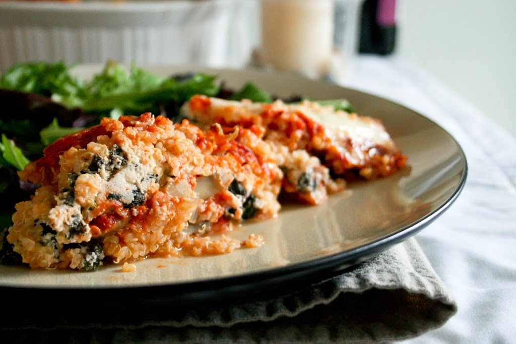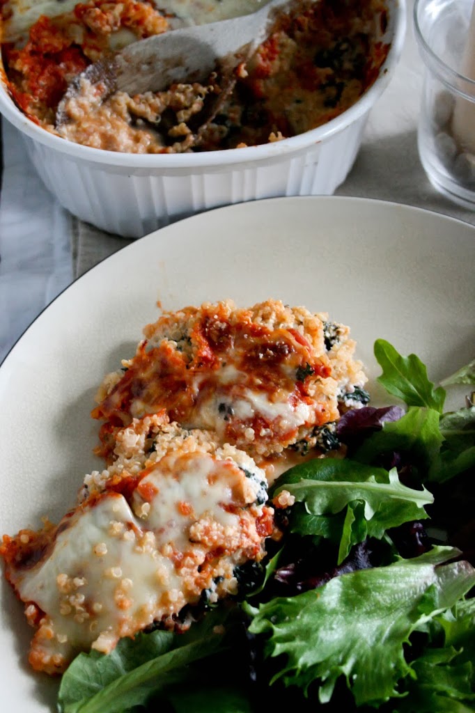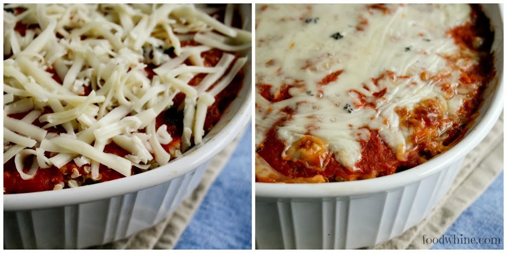 - In a greased 3 quart baking dish, layer half of quinoa, then half of pasta sauce. Sprinkle with 1/2 cup of mozzarella, followed by all of mushroom mixture and all of ricotta/kale mixture, then top with the remaining quinoa, pasta sauce, and finally sprinkle with remaining mozzarella cheese.