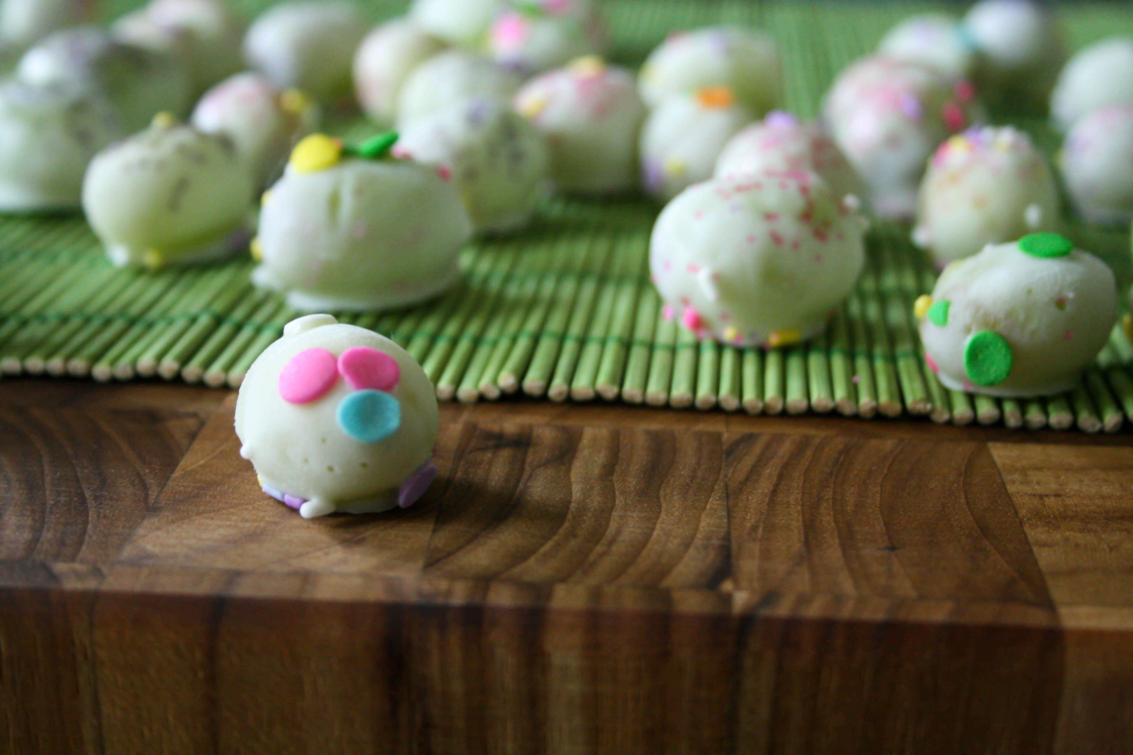 Easter’s almost here and the kids are getting excited about all the candy that the Easter Bunny is going to be bringing them…oh goodie. Okay, so I’m a little less thrilled about the whole candy thing than they are. It’s not that I don’t like candy, but it seems like we are bombarded with sugary treats at every holiday. Sometimes it’s nice to have a break from candy and enjoy something relatively healthy that still seems like a treat, like these frozen grapes covered in vanilla yogurt. When you decorate them with a light dusting of sprinkles, they look like tiny Easter eggs!