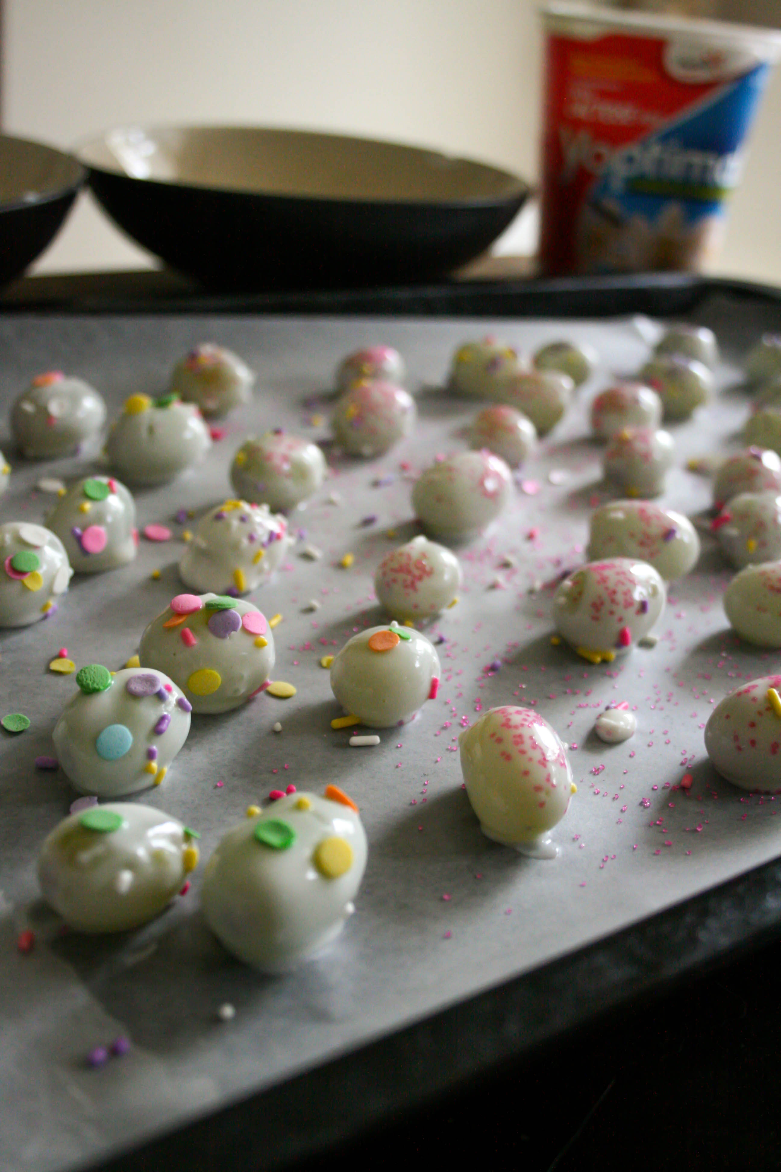 The best part is that they’re really easy to make. All you need is vanilla yogurt (I used Yoptimal by Yoplait), grapes, and sprinkles.
