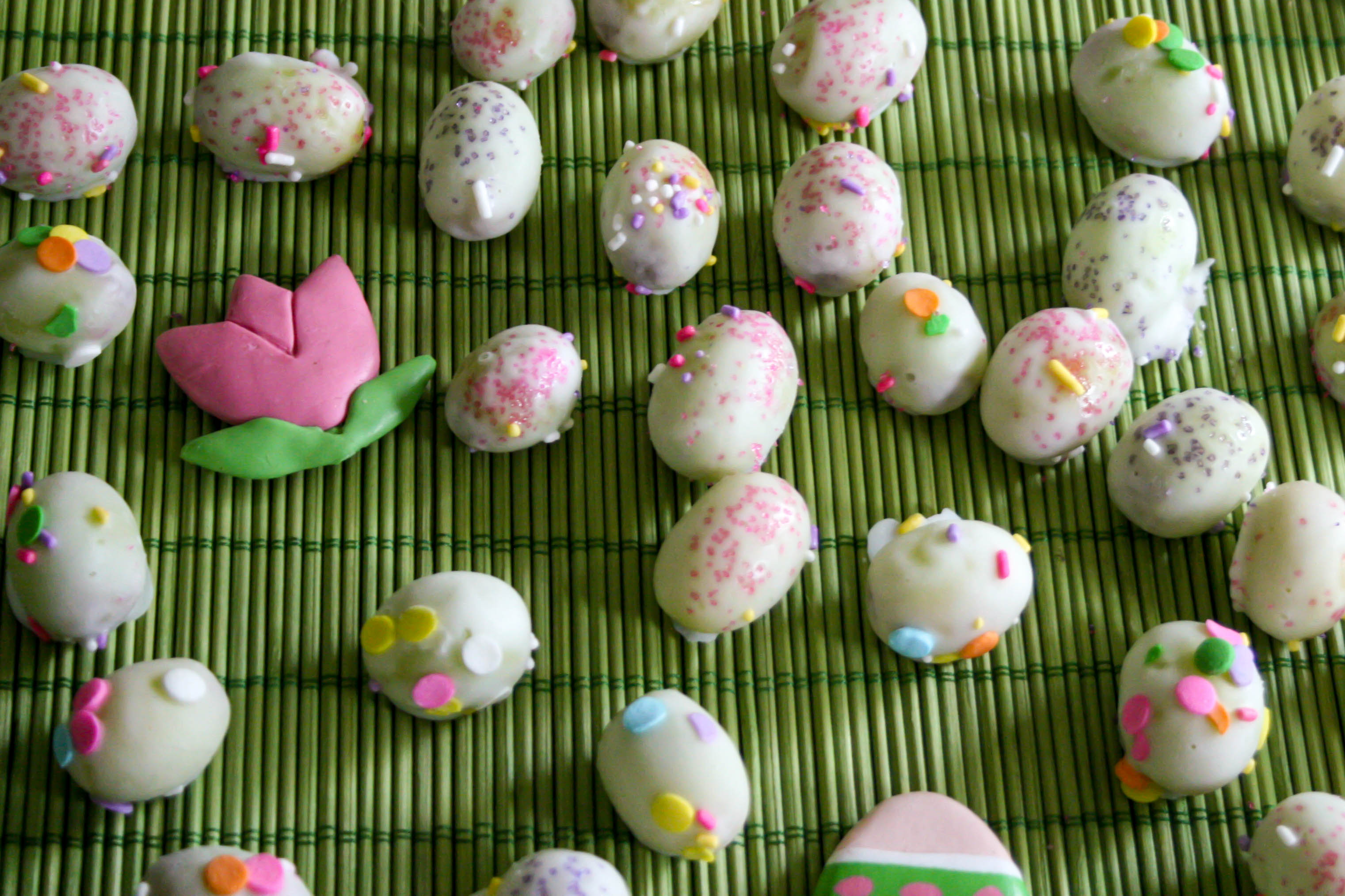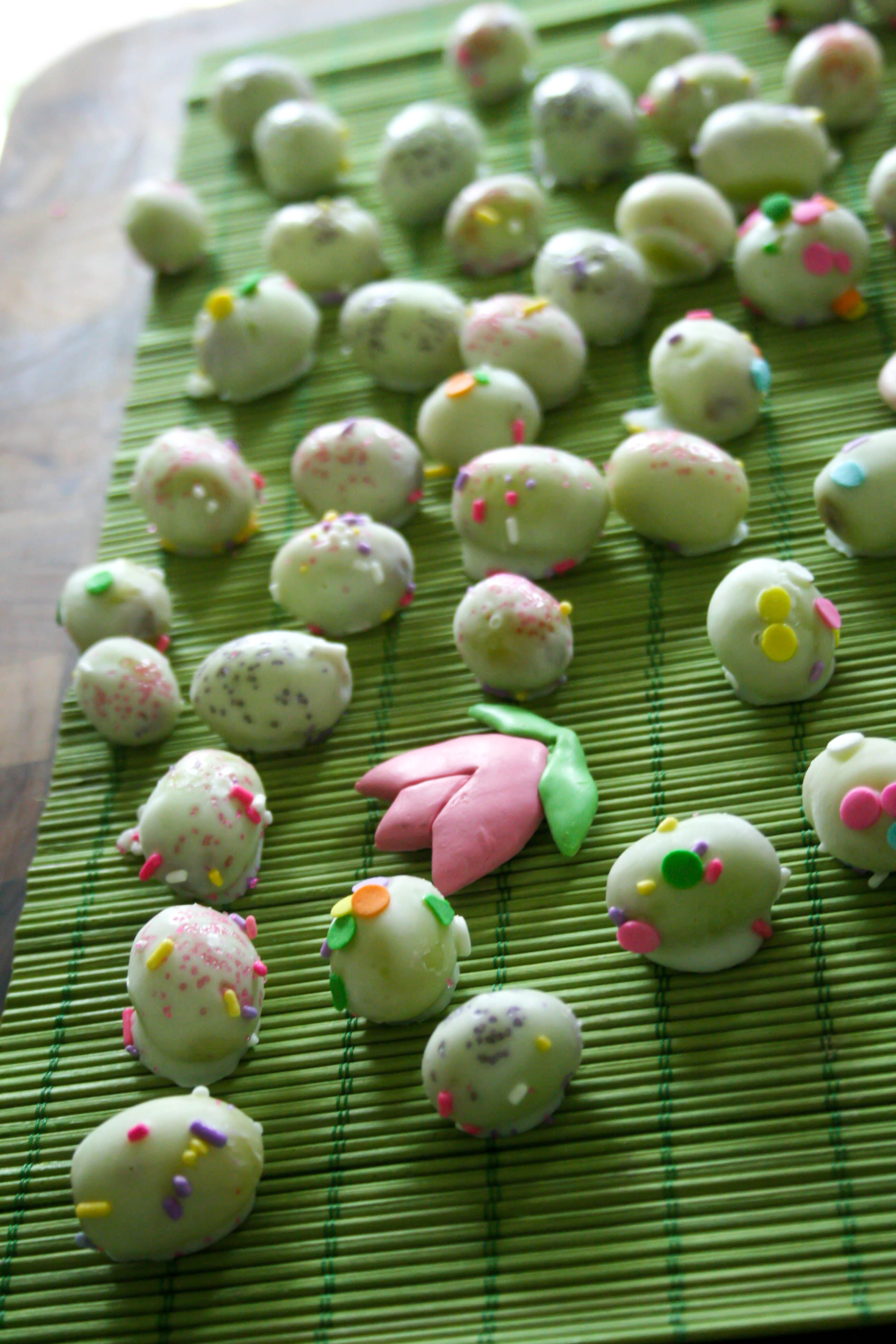 Of course, you could have these without sprinkles if you want to be even healthier, but it makes a fun Easter project to do with your kids if you let them help decorate the grapes with you.