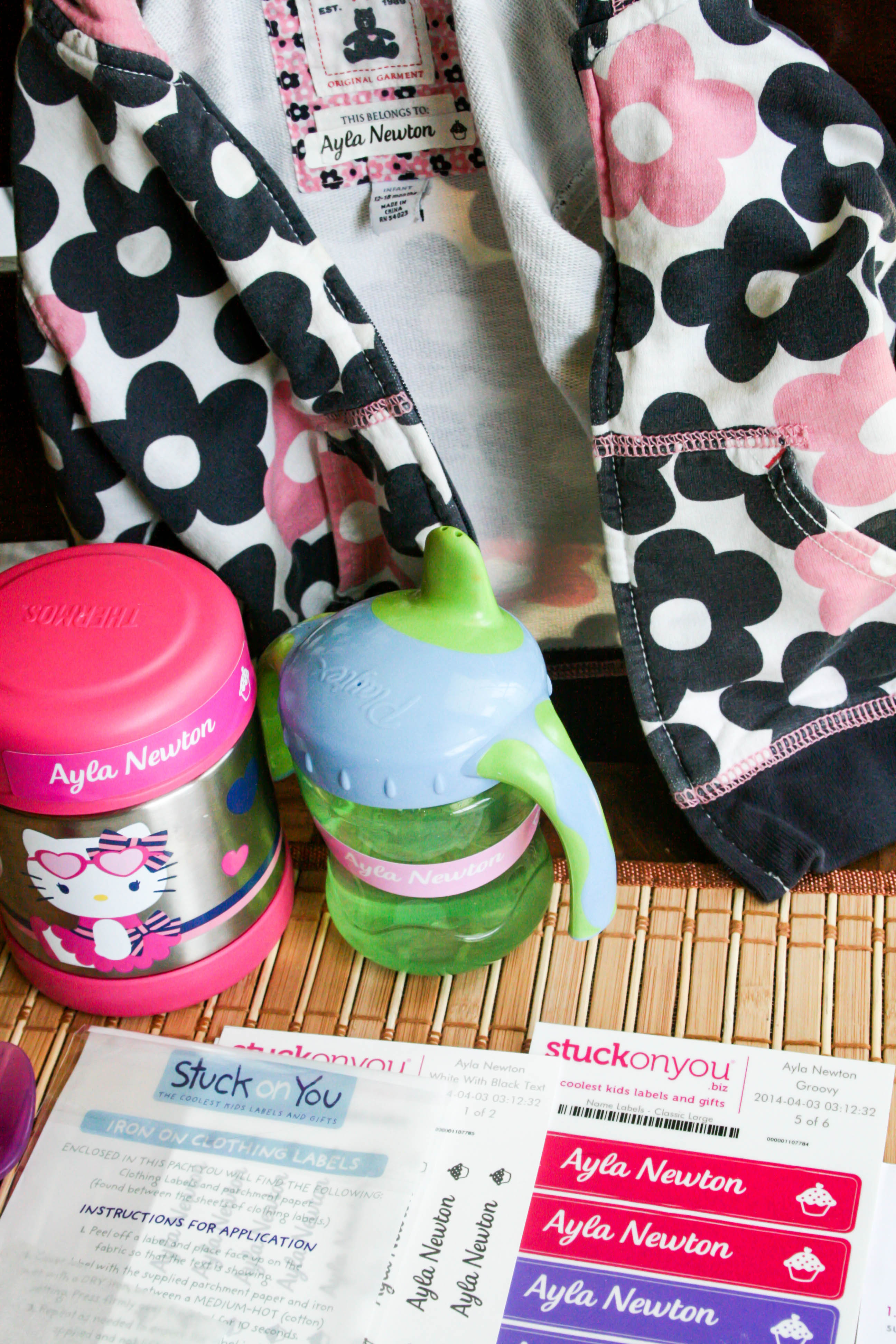 With Ayla in daycare, I have to label everything she brings there, so I was pretty excited when Stuck on You asked me to review their product.  I selected the large classic labels. I love the variety of styles, colours, and even icons that you can choose from. I picked out the “groovy” colour palette, “cocoa” font, and a cupcake for the icon. Ayla has cupcake curtains in her room, so I thought it would be cute to have matching labels.  I also received iron-on clothing labels with the same font and icon.
