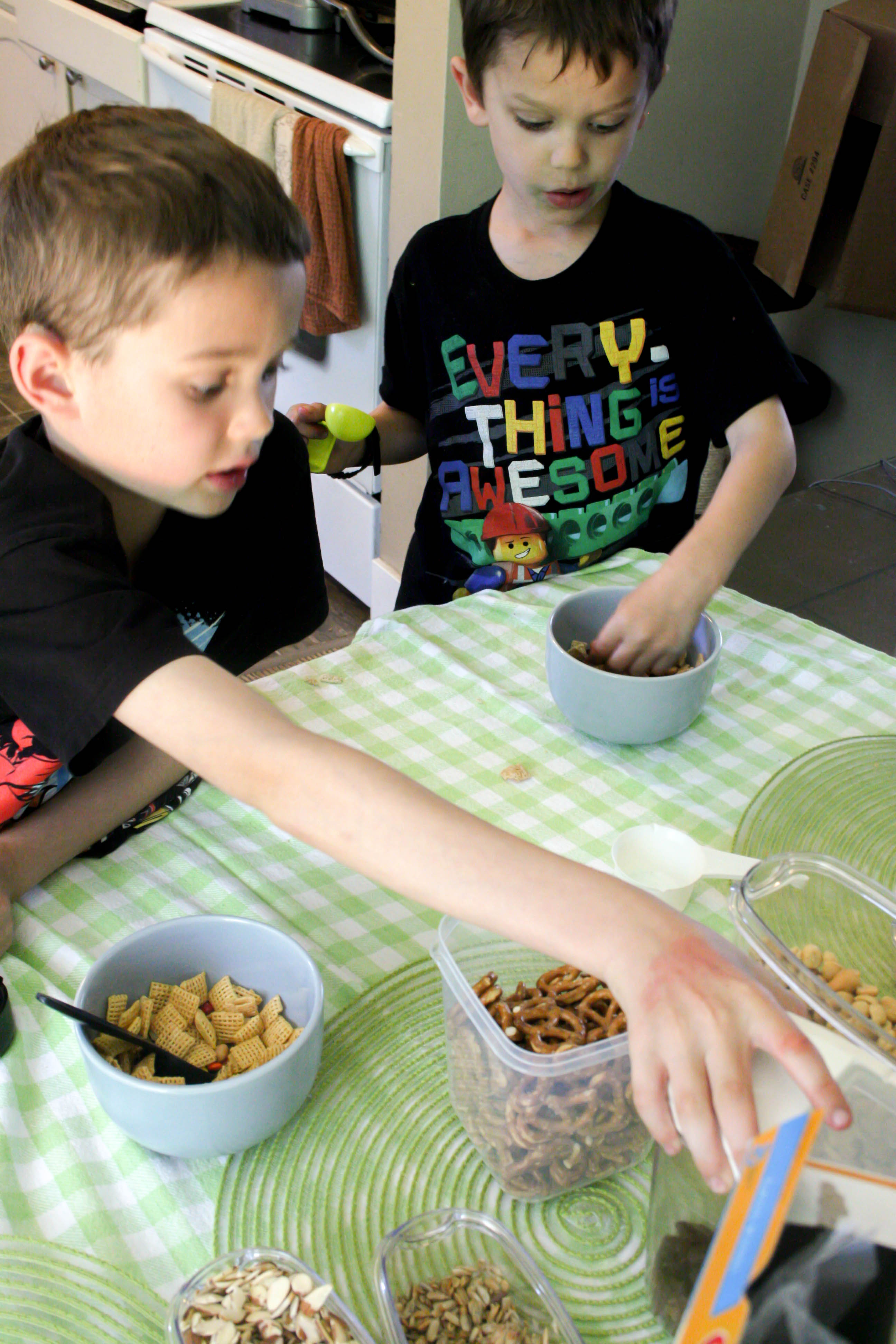 The boys had a lot of fun making their mixes. Bennett went a little heavy on the chocolate and other sugary items, so his snack mix wasn’t the healthiest of snacks, but at least it was something to keep him busy.