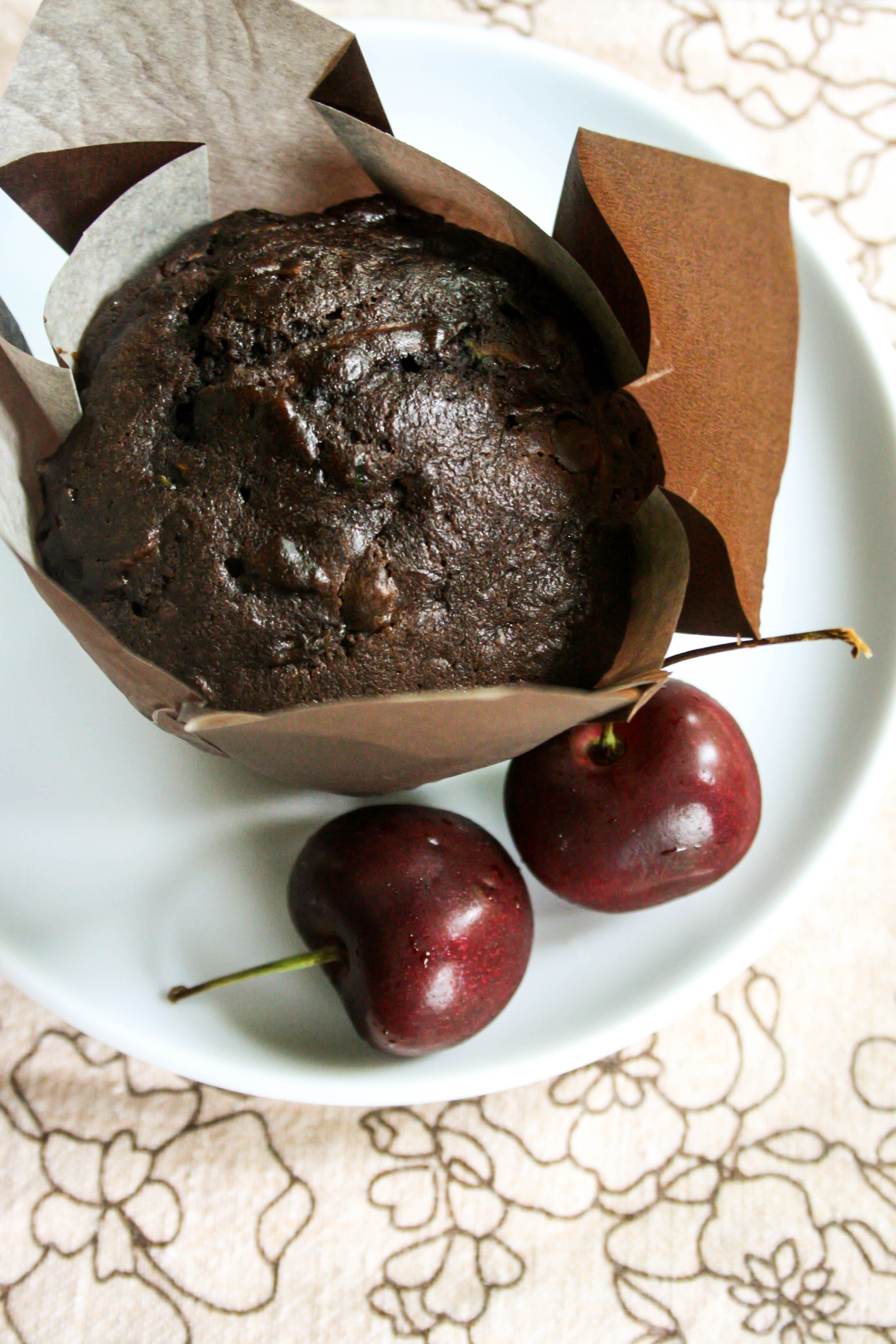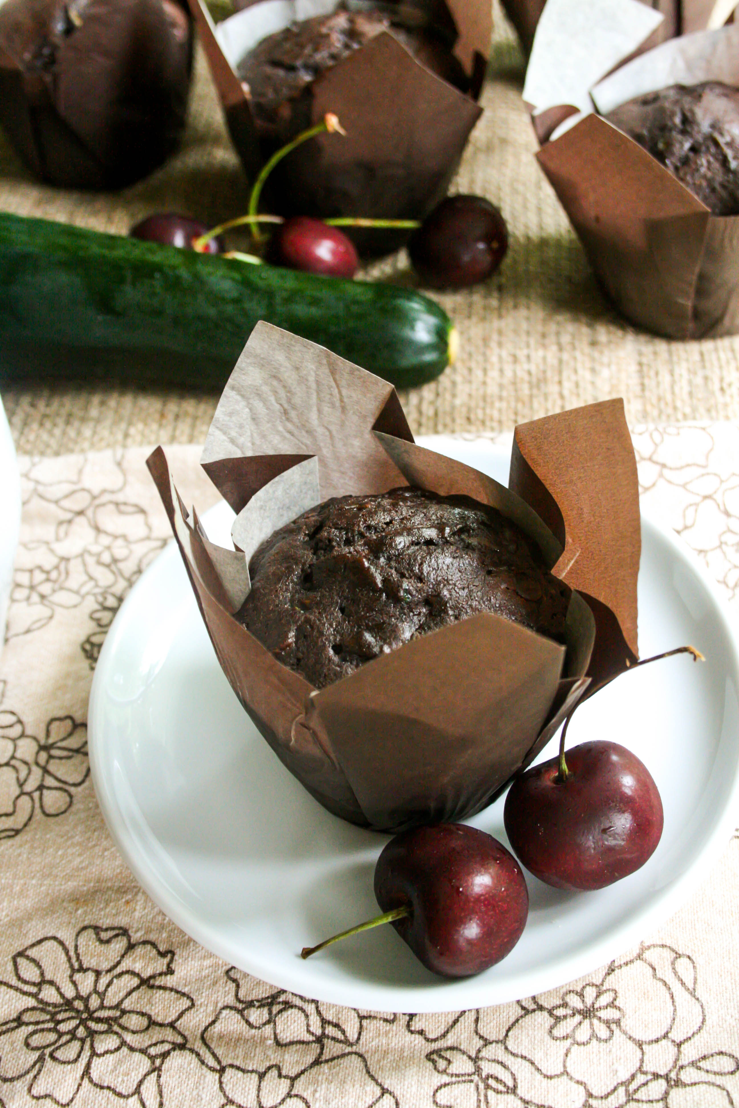 I am up to my eyeballs in cherries right now. Tony brings them home from work by the bucketful, so I’ve been trying to find ways to use them up. I decided to try using them in muffins, and I thought chocolate and cherries would go well together. And I figured why not throw a zucchini in there while I’m at it?