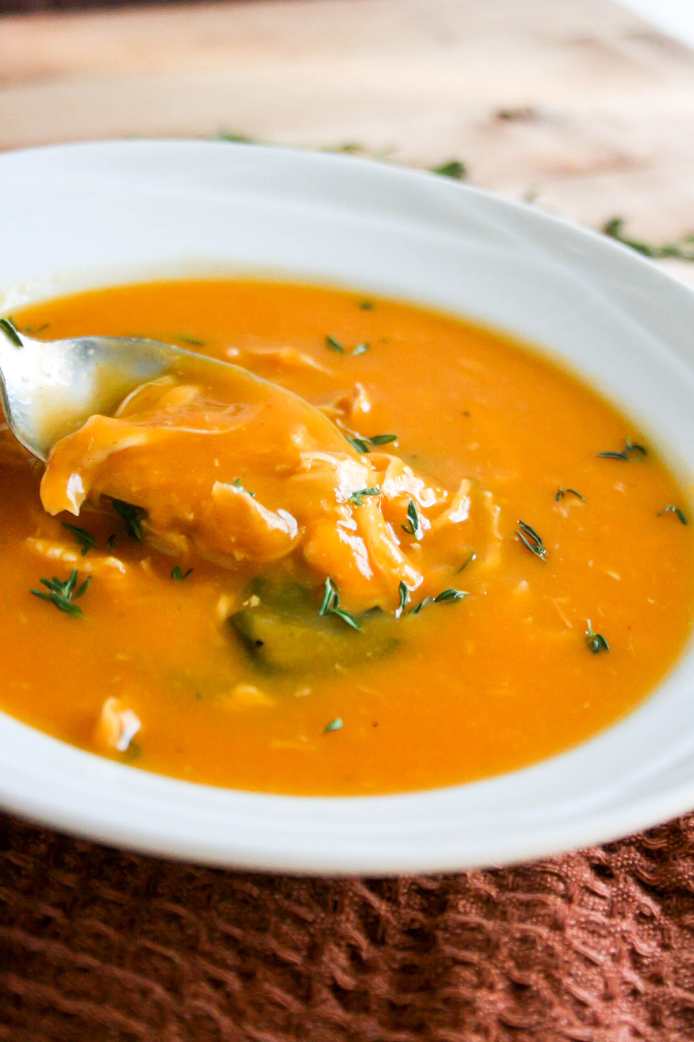 Now that fall is here, I think it’s time for a soup recipe. I had some leftover chicken and fresh thyme from the Roast Chicken recipe I posted recently. There’s always an ample supply of butternut squash and yams this time of year, so I added those ingredients to the soup as well. I threw a few handfuls of baby spinach in there while I was at it, to add more colour and nutrition.