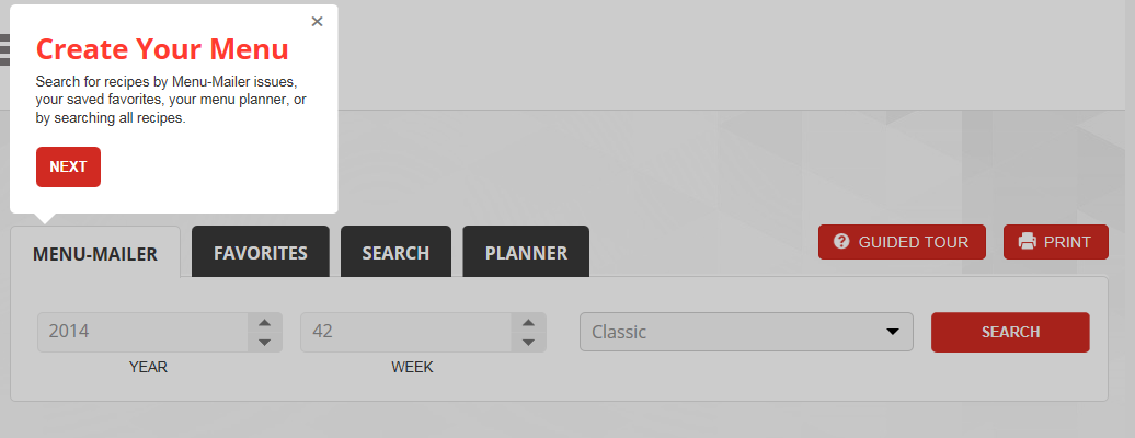 When you first log in, you arrive at the dashboard. It has a friendly welcome, clean and simple layout, with easy navigation.  It offers to give you a guided tour, if you need it. I’m doing that for you here!  It offers a complete printable weekly menus for Classic, Paleo, Low Carb, and daytime options.  You can select a menu for 2 people, or 6 people – whatever works for your family. The menus include recipes and grocery lists.  They have everything you need for the week all in one document.  Just print it off, do your grocery shopping, and you’re ready to go!
