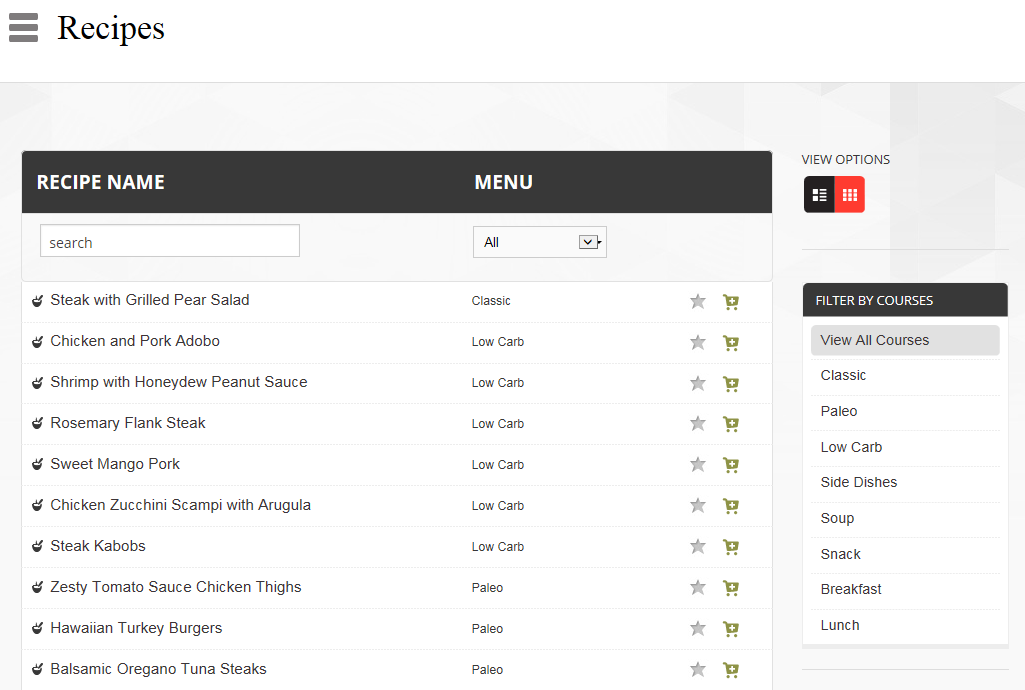 If you feel like browsing through recipes and picking out some favourites to try later, select RECIPES from the sidebar. There’s a huge selection of recipes, and you can filter them by courses and menu-type.  Click on the star to add to favourites, or click on the shopping cart to add the ingredients to your shopping list.