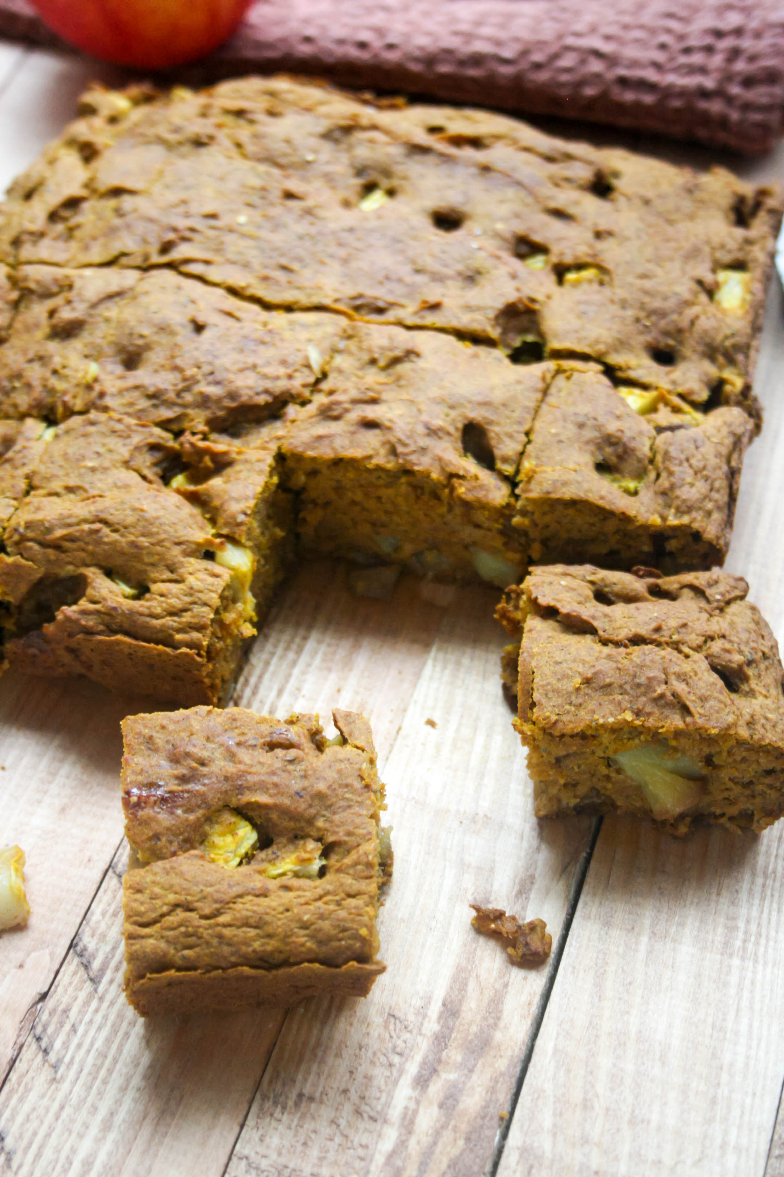 Made with pumpkin puree, bits of fresh apple and ground flax seed, this cake is healthy enough to be called a snack rather than a dessert. It’s like one big muffin cut into squares. You could probably use the batter in muffin tins if you prefer, but I just find it easier to pour it all out into one pan. It takes a little longer to bake that way, but at least it’s less work for me.