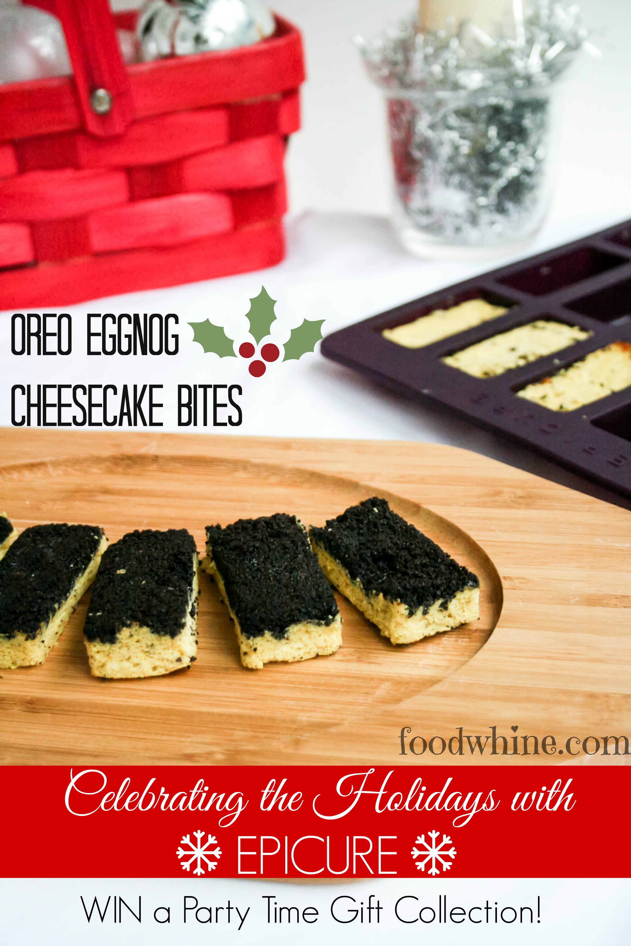 This year, Epicure gave us a bunch of holiday baking goodies to try, including a Perfect Petites baking tray and Eggnog Cheesecake Mix. I knew what I had to make: mini Eggnog Cheesecakes! I searched Epicure’s website and found a great recipe for Big Batch Eggnog Bars with Rum Ganache. I adapted it slightly and came up with these cute Oreo Eggnog Cheesecake Bites.