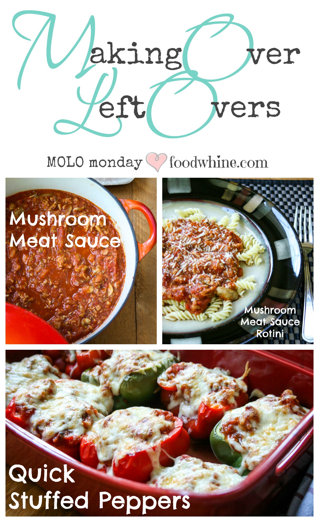 Today, I’m making over leftover meat sauce into quick stuffed peppers. On the first day, I make a big pot Mushroom Meat Sauce. I let it simmer on low until it’s dinner-time, then serve it over Rotini.