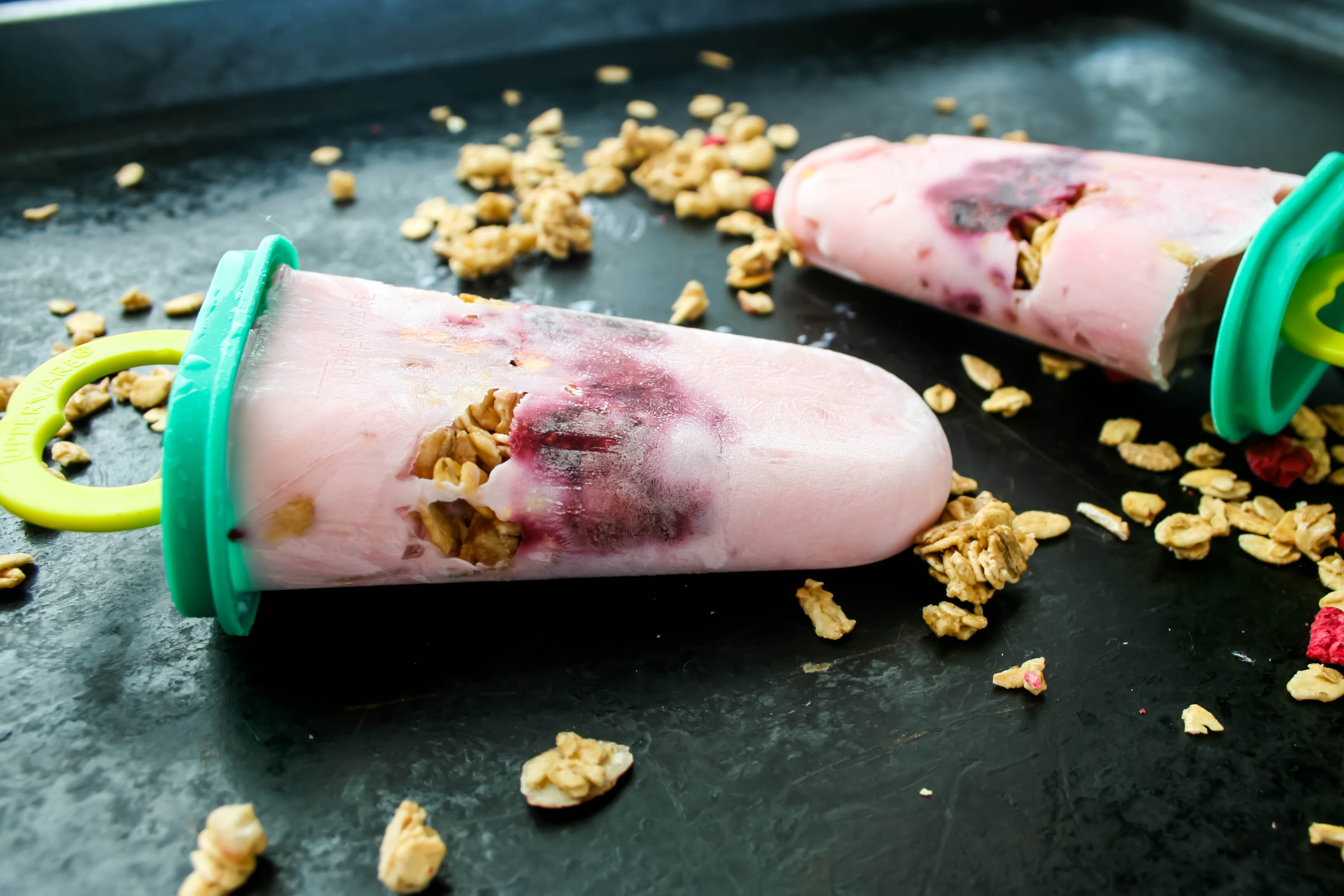 This recipe is basically a yogurt parfait, but frozen on a stick. It has layers of yogurt, fruit, and granola. Granola in a popsicle may sound odd, but it’s actually surprisingly good. It’s such a fun and unique way to eat breakfast.
