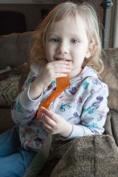 Bennett has been asking for fruit roll-ups a lot lately. I guess they must be a popular treat at school right now, and I think they’re fine as a treat, but not something I want to feed my kids every day. I remembered I used to make homemade fruit roll-ups when the kids were younger, so I thought I should give it a try again.