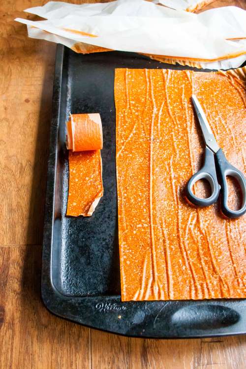 The only thing with the reusable stuff is that you can’t cut it with the fruit roll-ups on it. With regular parchment paper, it’s nice to just cut it up and roll it up with the paper still on so it makes it easier to unroll later when you want to eat it. Without the parchment paper, it’s a bit stickier, but it does still work.